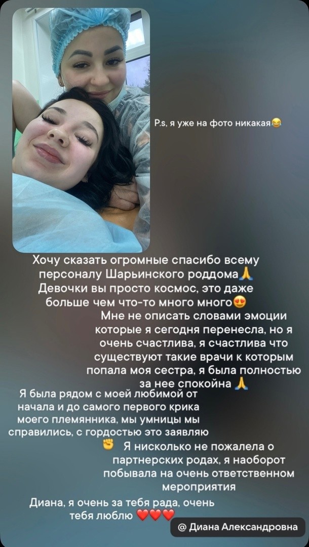 Нина Витальевна, будучи мамой, решила поддержать свою сестру Диану и стать её партнером в этот волнующий момент. В день Х, когда начались схватки, Диана и Нина были рядом. О том, как всё прошло она поделилась в социальных сетях и написала благодарность нашим докторам.